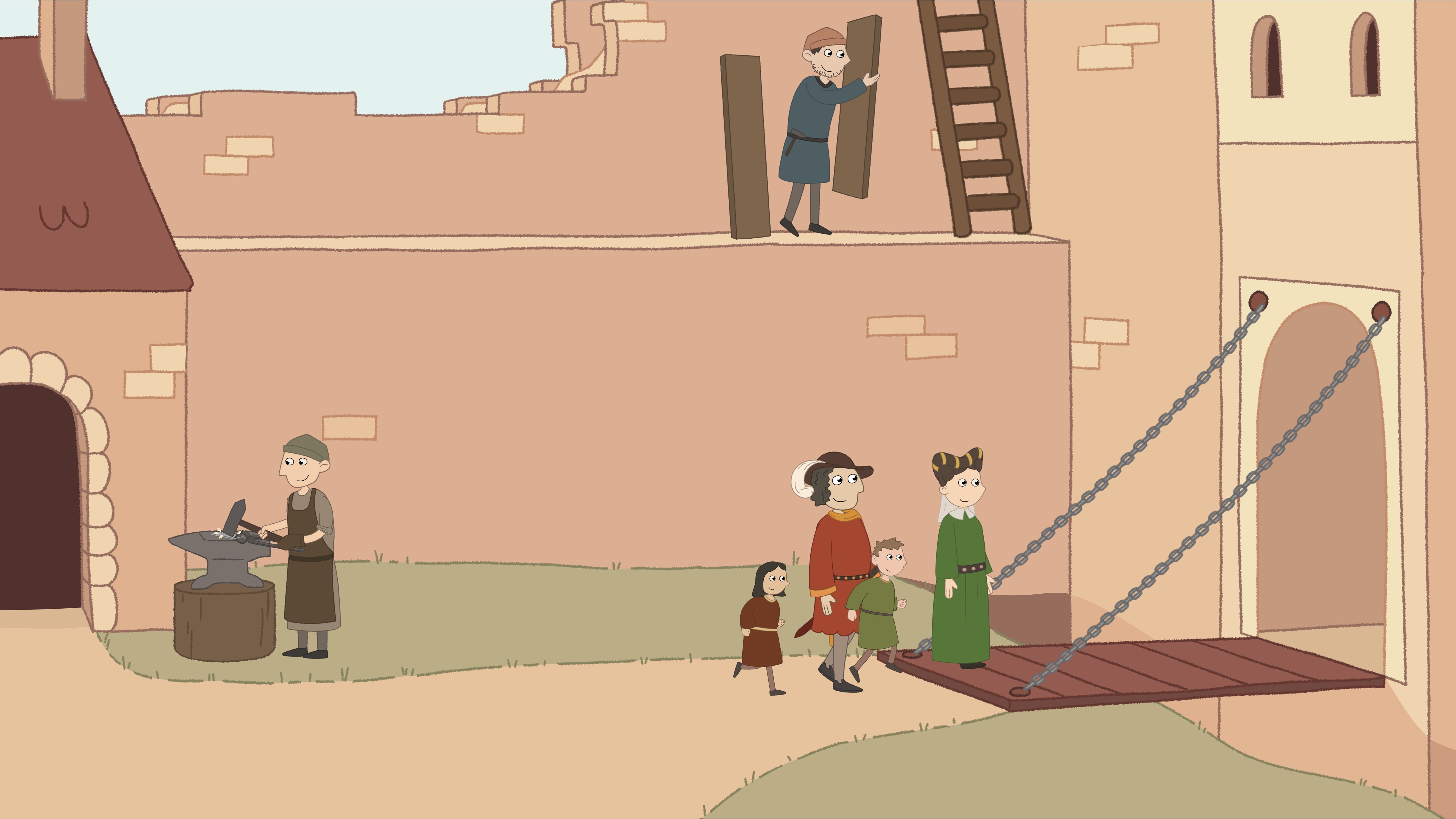 Die Anwendung ist wie ein lebendiges Wimmelbild aufgebaut: Auf dem Bildschirm herrscht geschäftiges Treiben: Armbrustschützen rüsten sich, Handwerker arbeiten an den Mauern, Hirten hüten Schweine. Wer die Figuren anklickt, startet kurze animierte Clips von jeweils rund 30 Sekunden. In elf Episoden werden zentrale Themen rund um das Leben auf einer mittelalterlichen Festung erklärt – vom Burgenbau über das Lehnswesen bis zur Bedeutung des Bergfrieds. „Uns war wichtig, das Mittelalter nicht als romantische Kulisse zu zeigen, sondern als lebendige Welt“, sagt Dr. Moritz Lange, Konservator bei den Staatlichen Schlössern und Gärten über das Projekt. Er ergänzt: „Die Filme zeigen, dass eine Burg ein eigener Mikrokosmos mit vielen Menschen war, die miteinander lebten und arbeiteten.“